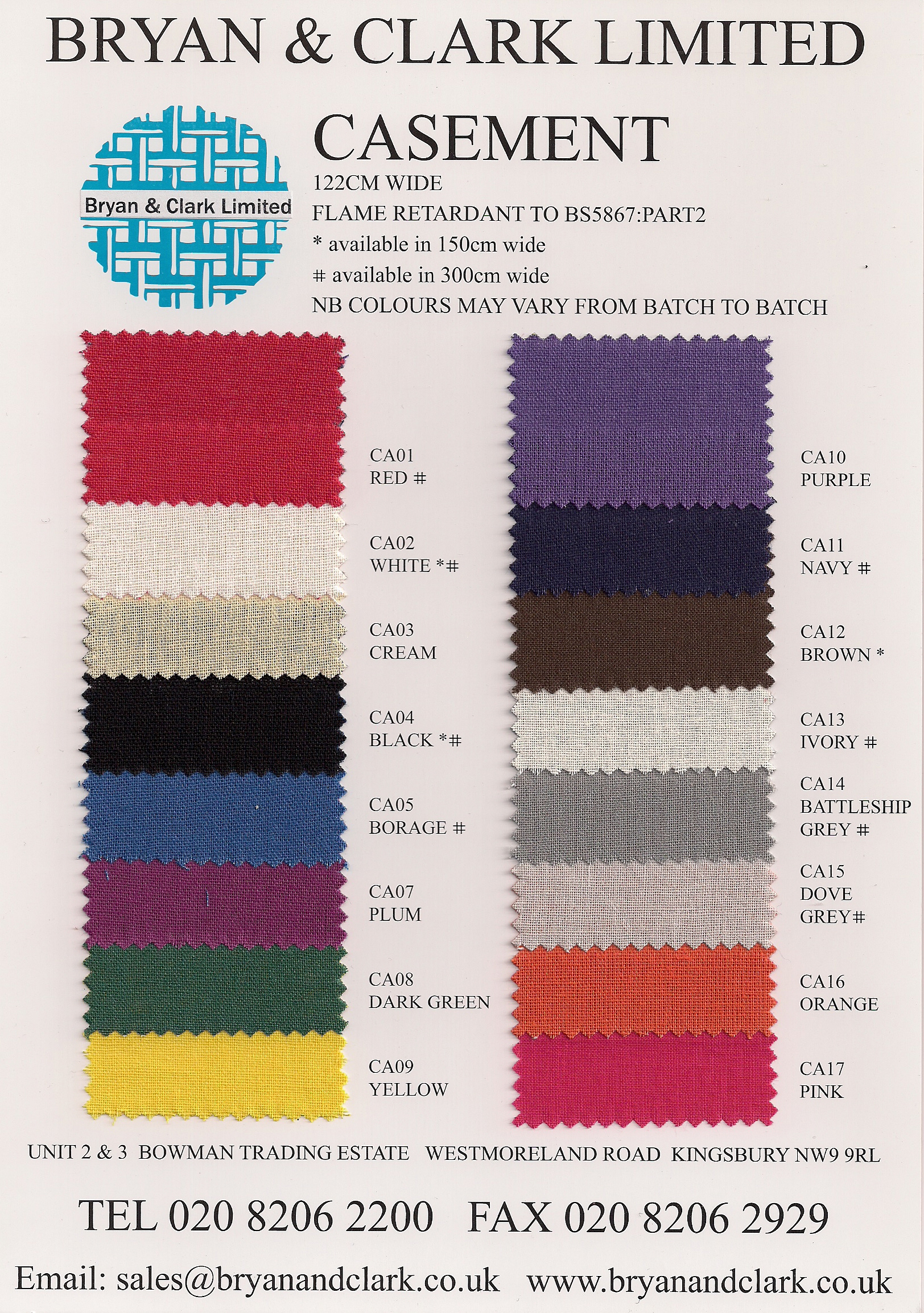 Casement is cotton fabric available in 122cm wide, flame retardant to BS5867 part 2. We hold 10 colours available from stock. Especially popular for themed events and marquee decoration.
